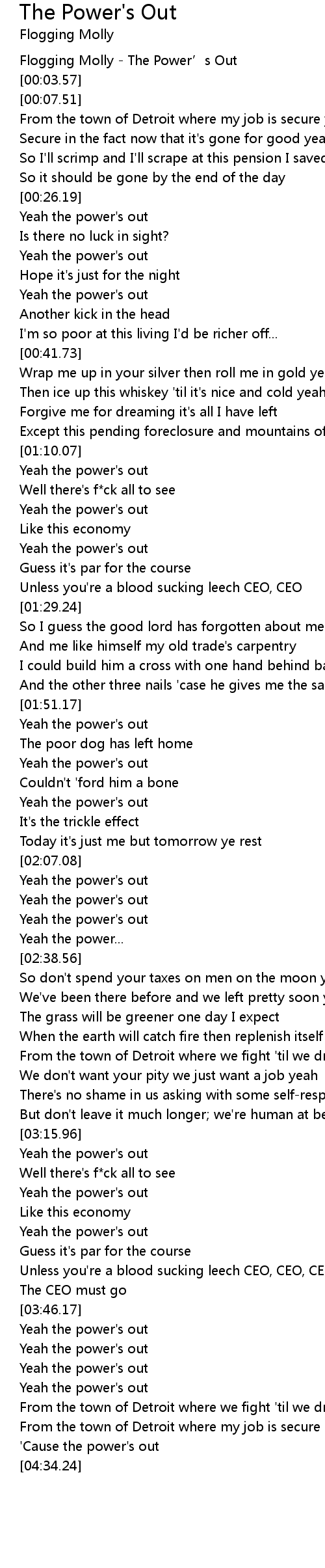 | [00:01.47] | Flogging Molly - The Power’s Out |