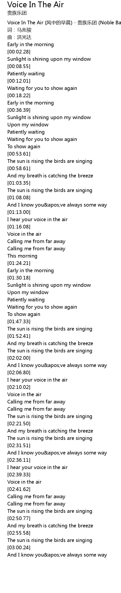 | [00:00.00] | Voice In The Air fēng zhōng de zǎo chén guì zú yuè tuán Noble Band |