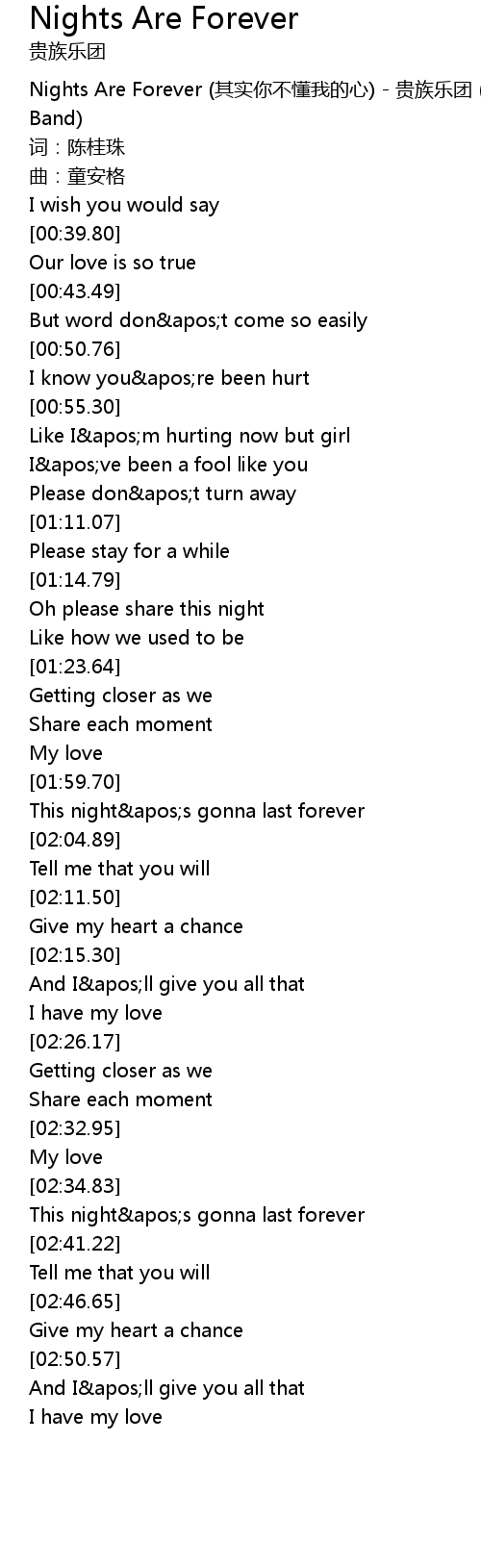 | [00:00.00] | Nights Are Forever (其实你不懂我的心) - 贵族乐团 (Noble Band) |