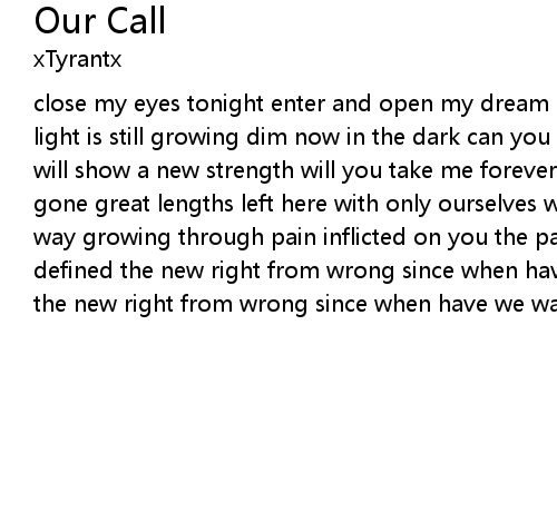 close my eyes tonight enter and open my dream dry my eyes kill my despair the light is still growing dim now in the dark can you hear my whisper listen, I will show a new strength will you take me forever for this leap of faith we have gone great lengths left here with only ourselves without a light, to lead the way growing through pain inflicted on you the path now lit by our hate we've defined the new right from wrong since when have we wanted regret we've defined the new right from wrong since when have we wanted regret |