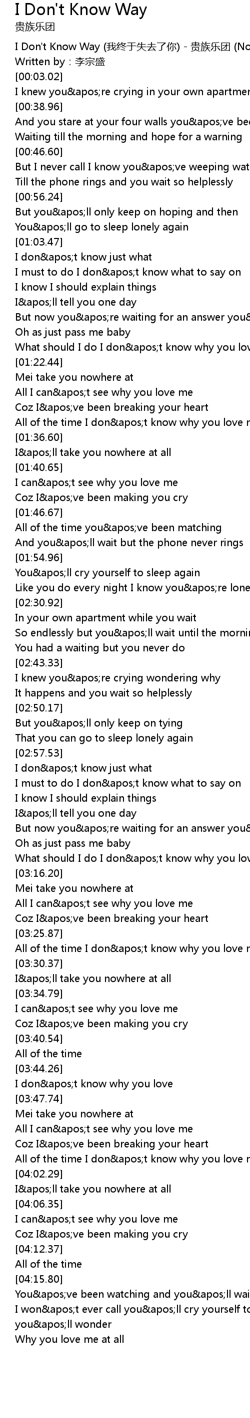 | [00:00.13] | I Don't Know Way (我终于失去了你) - 贵族乐团 (Noble Band) |