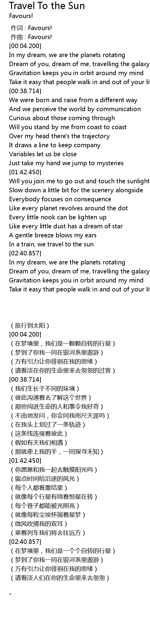 | [02:29.649] | In a train, we travel to the sun |