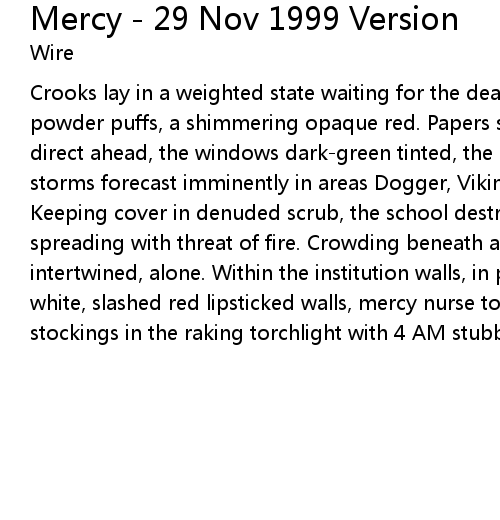 Crooks lay in a weighted state waiting for the dead assassin while the rust pure powder puffs, a shimmering opaque red. Papers spread, no-one driving, we hurled direct ahead, the windows dark-green tinted, the hearse a taxi instead. Snow storms forecast imminently in areas Dogger, Viking, Moray, Forth, and Orkney. Keeping cover in denuded scrub, the school destroyed raised the club, panic spreading with threat of fire. Crowding beneath a layer of foam, refugees intertwined, alone. Within the institution walls, in pastel blue, clinical white, slashed red lipsticked walls, mercy nurse tonight. Seems like dark grey stockings in the raking torchlight with 4 AM stubble, a midnight transvestite. |