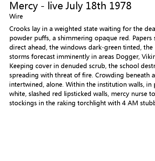 Crooks lay in a weighted state waiting for the dead assassin while the rust pure powder puffs, a shimmering opaque red. Papers spread, no-one driving, we hurled direct ahead, the windows dark-green tinted, the hearse a taxi instead. Snow storms forecast imminently in areas Dogger, Viking, Moray, Forth, and Orkney. Keeping cover in denuded scrub, the school destroyed raised the club, panic spreading with threat of fire. Crowding beneath a layer of foam, refugees intertwined, alone. Within the institution walls, in pastel blue, clinical white, slashed red lipsticked walls, mercy nurse tonight. Seems like dark grey stockings in the raking torchlight with 4 AM stubble, a midnight transvestite. |