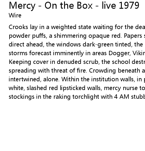 Crooks lay in a weighted state waiting for the dead assassin while the rust pure powder puffs, a shimmering opaque red. Papers spread, no-one driving, we hurled direct ahead, the windows dark-green tinted, the hearse a taxi instead. Snow storms forecast imminently in areas Dogger, Viking, Moray, Forth, and Orkney. Keeping cover in denuded scrub, the school destroyed raised the club, panic spreading with threat of fire. Crowding beneath a layer of foam, refugees intertwined, alone. Within the institution walls, in pastel blue, clinical white, slashed red lipsticked walls, mercy nurse tonight. Seems like dark grey stockings in the raking torchlight with 4 AM stubble, a midnight transvestite. |