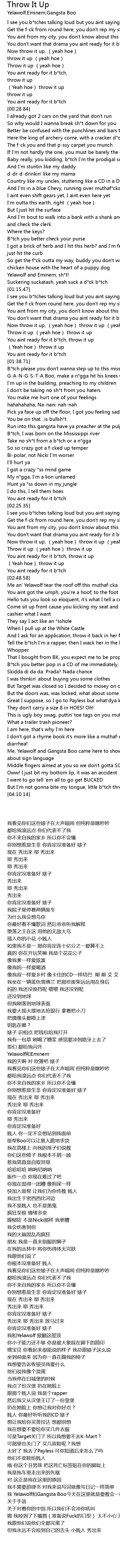 | [04:07.24] | But I'm not gonna bite my tongue, little b*tch throw it up |
