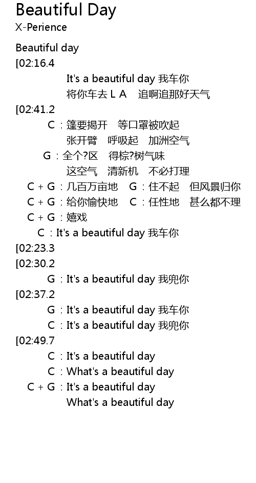 | [02:20.1] | G:It's a beautiful day 我车你 |