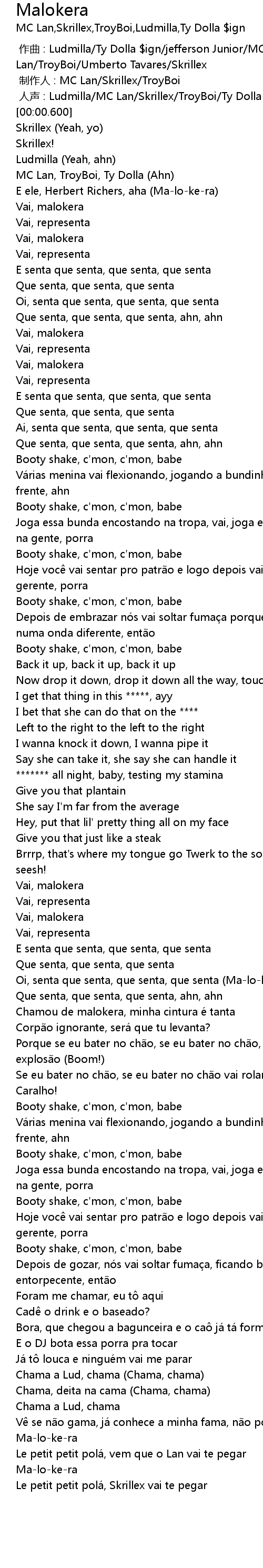 | [00:00.400] | 人声 : Ludmilla/MC Lan/Skrillex/TroyBoi/Ty Dolla $ign |
