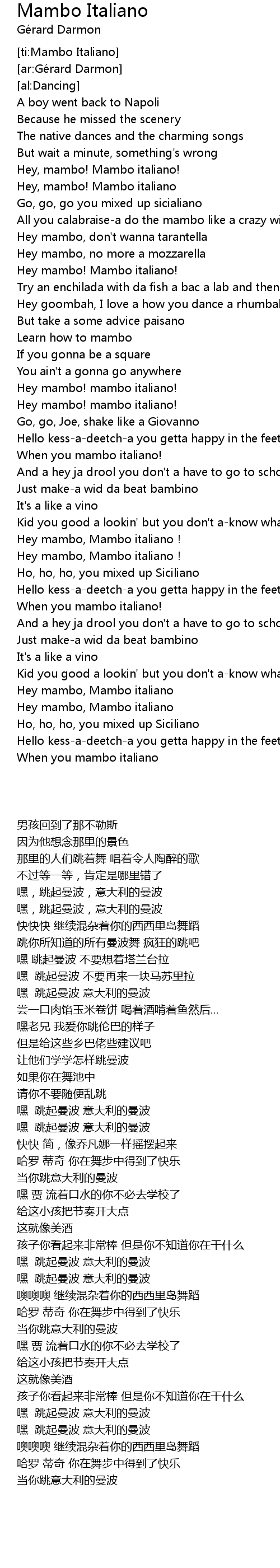| [00:19.13] | Hey, mambo! Mambo italiano! |