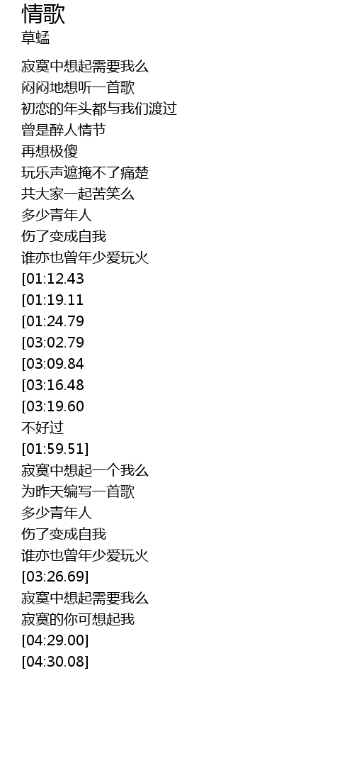 | [03:49.57][03:02.79][01:35.01] | 谁了解今天虽不开心都唱情歌 |