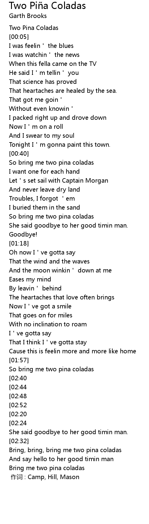 | [02:32] | Bring, bring, bring me two pina coladas |