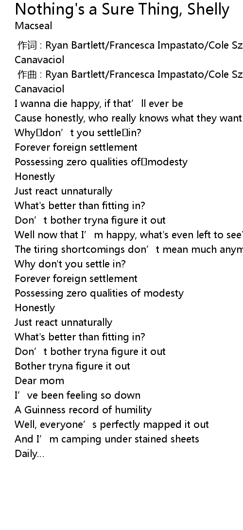 | [00:00.00] | zuò cí : Ryan Bartlett Francesca Impastato Cole Szilagyi Justin Canavaciol |