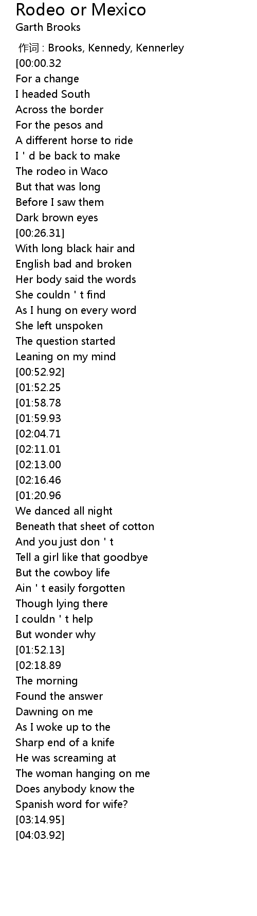 | [03:16.18][01:52.25][00:53.54] | Rodeo or Mexico |