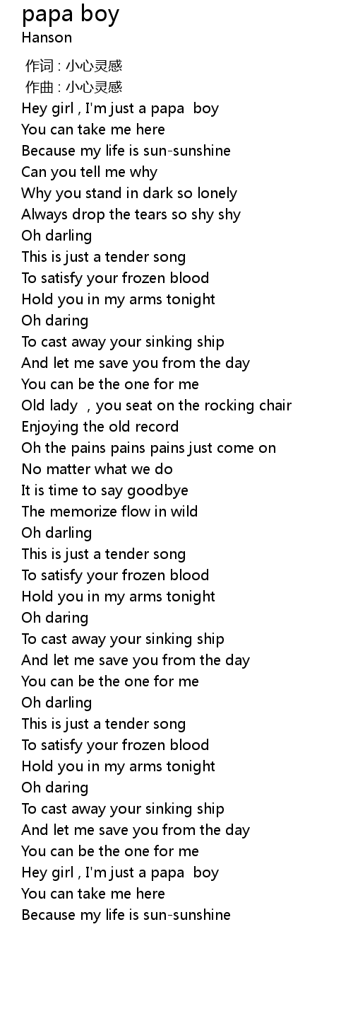| [00:27.545] | Hey girl , I' m just a papa boy |