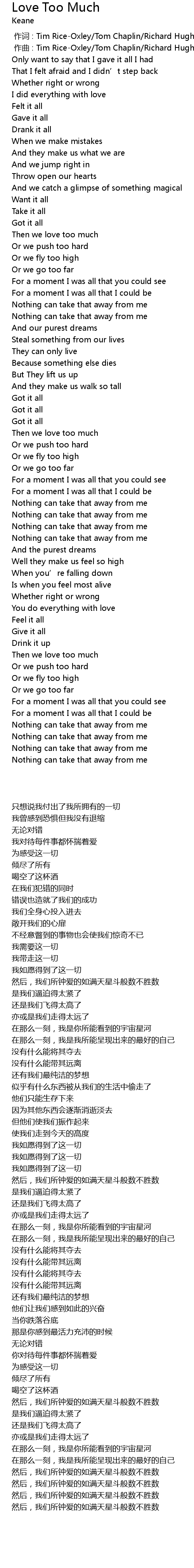 | [00:00.00] | 作词 : Tim Rice-Oxley/Tom Chaplin/Richard Hughes/Jesse Quin |