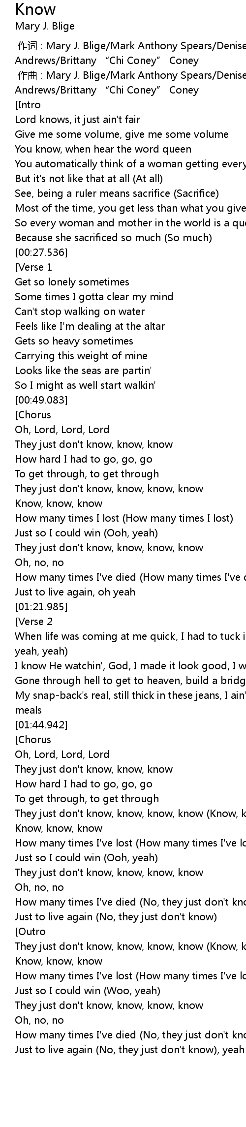 | [00:00.958] | 作曲 : Mary J. Blige/Mark Anthony Spears/Denisea "Blue June" Andrews/Brittany “Chi Coney” Coney |