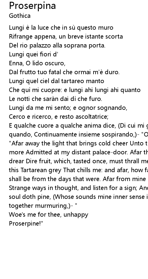 | E qualche cuore a qualche anima dice, Di cui mi giunge il suono da quando in quando, Continuamente insieme sospirando, " Oimè per te, Proserpina infelice!" " Afar away the light that brings cold cheer Unto this wall, one instant and no more Admitted at my distant palacedoor. Afar the flowers of Enna from this drear Dire fruit, which, tasted once, must thrall me here. Afar those skies from this Tartarean grey That chills me: and afar, how far away, The nights that shall be from the days that were. Afar from mine own self I seem, and wing Strange ways in thought, and listen for a sign And still some heart unto some soul doth pine, Whose sounds mine inner sense is faith to bring, Continually together murmuring, " | |