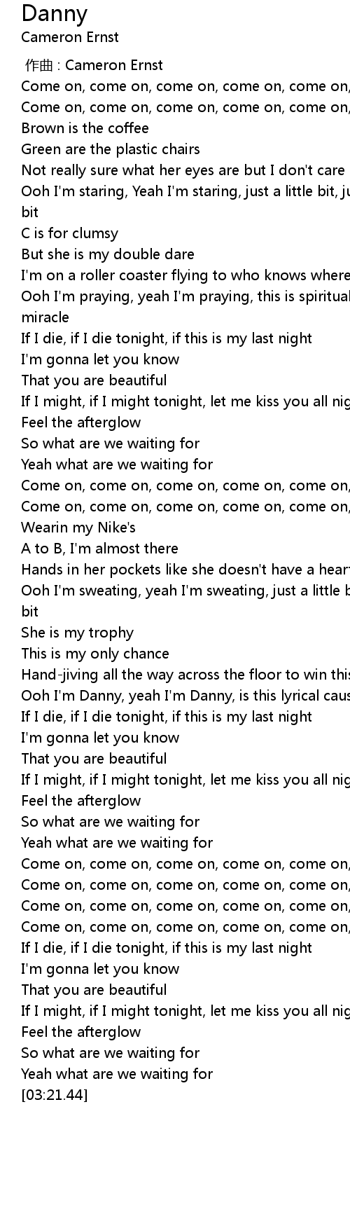 | [01:51.02] | Ooh I'm Danny, yeah I'm Danny, is this lyrical cause I need a miracle |