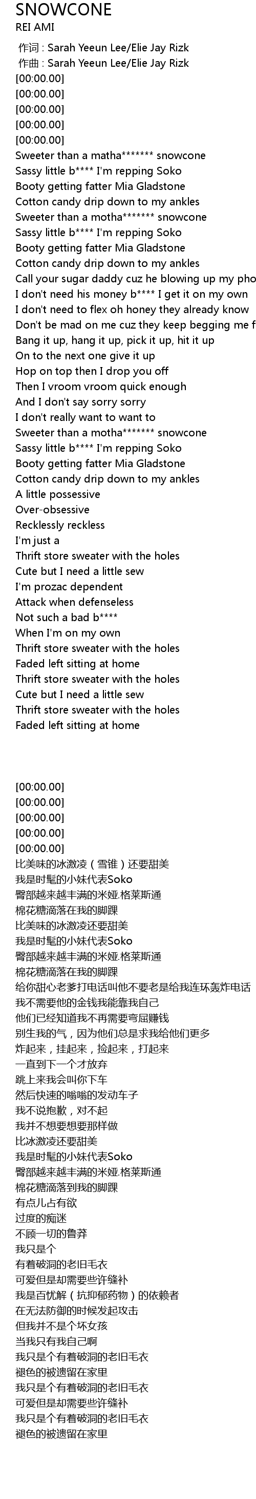 | [00:15.700] | Sweeter than a matha******* snowcone |