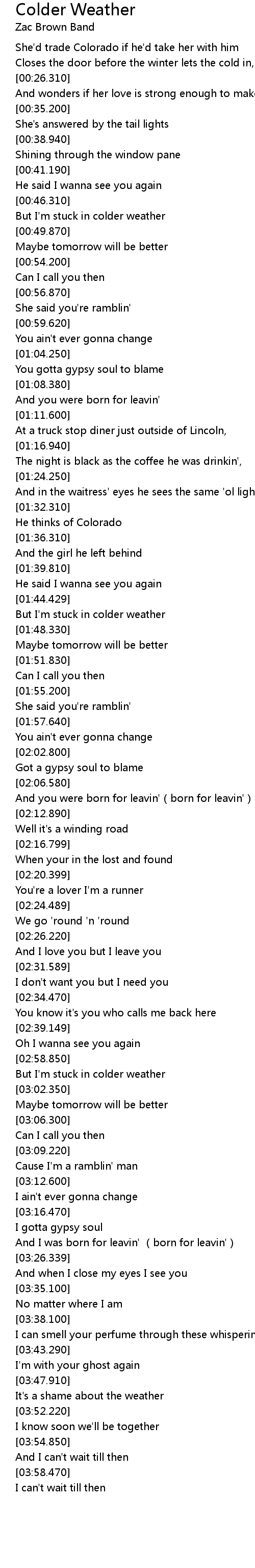 | [00:14.489] | She'd trade Colorado if he'd take her with him |