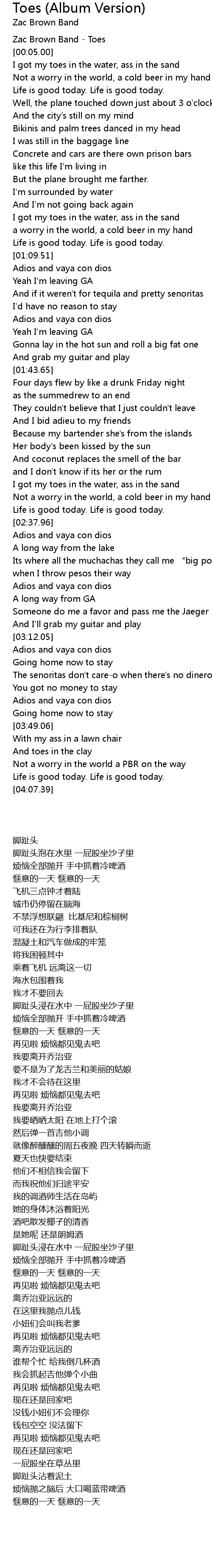 | [00:01.00] | Zac Brown Band Toes |