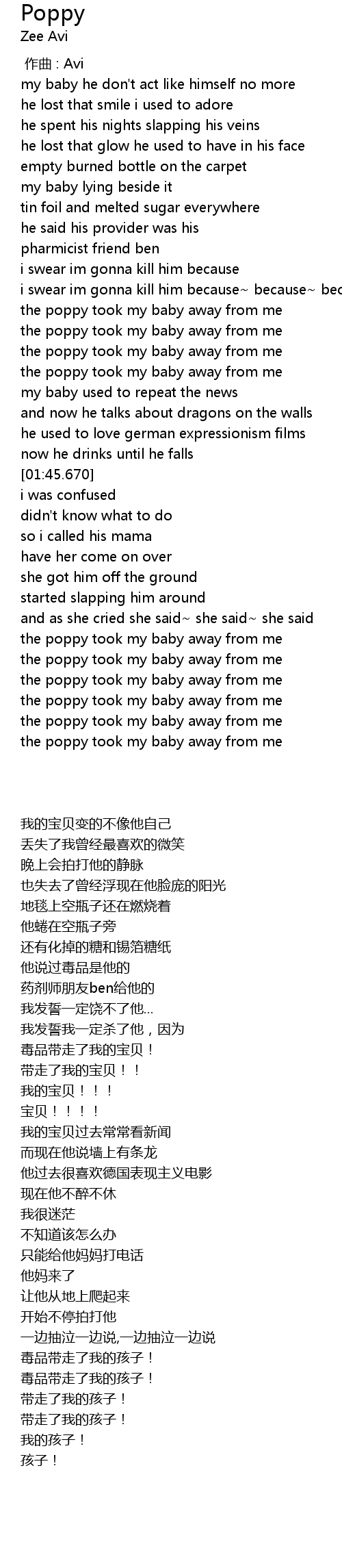 | [02:06.100] | the poppy took my baby away from me |