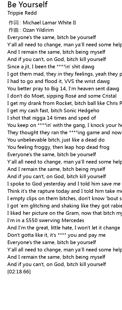 | [01:58.19] | Everyone's the same, bitch be yourself |