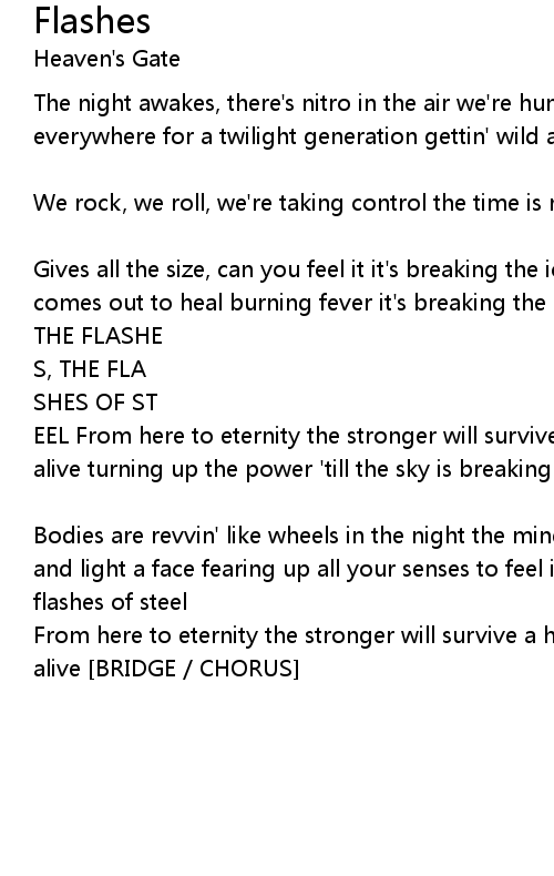 EEL From here to eternity the stronger will survive a human dynamo, kickin' and alive turning up the power 'till the sky is breaking up believe in metal gods, they will never stop [BRIDGE / CHORUS] |