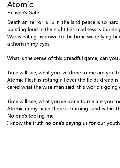 Atomic Flesh is rotting all over the fields dread is spreading unbound nobody cared what the wise man said: this world's going down to the ground [PRE-CHORUS] [CHORUS:] |