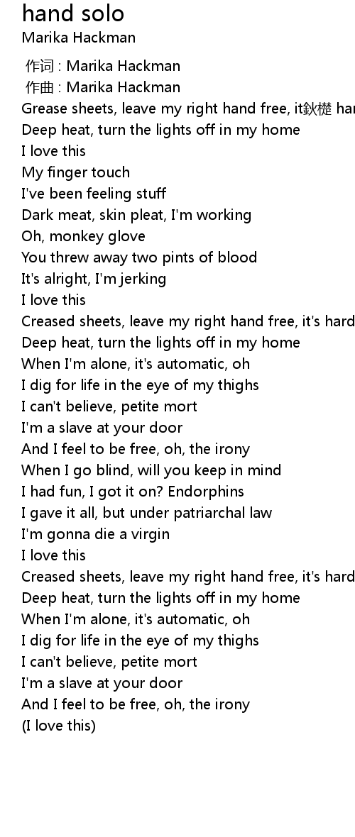 | [00:03.853] | Grease sheets, leave my right hand free, it huo chu hard to be alone |