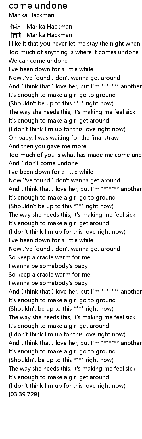 | [03:24.682] | It' s enough to make a girl go to ground |