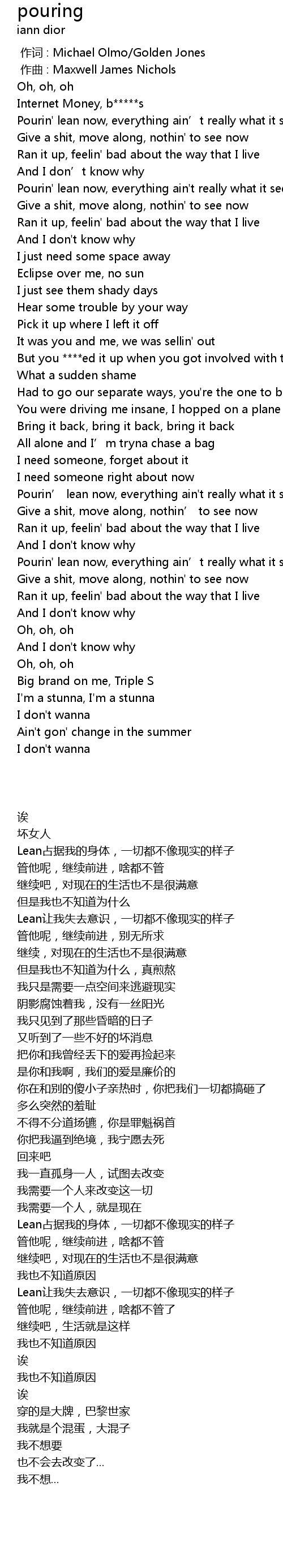 | [00:21.96] | Pourin' lean now, everything ain' t really what it seems now |