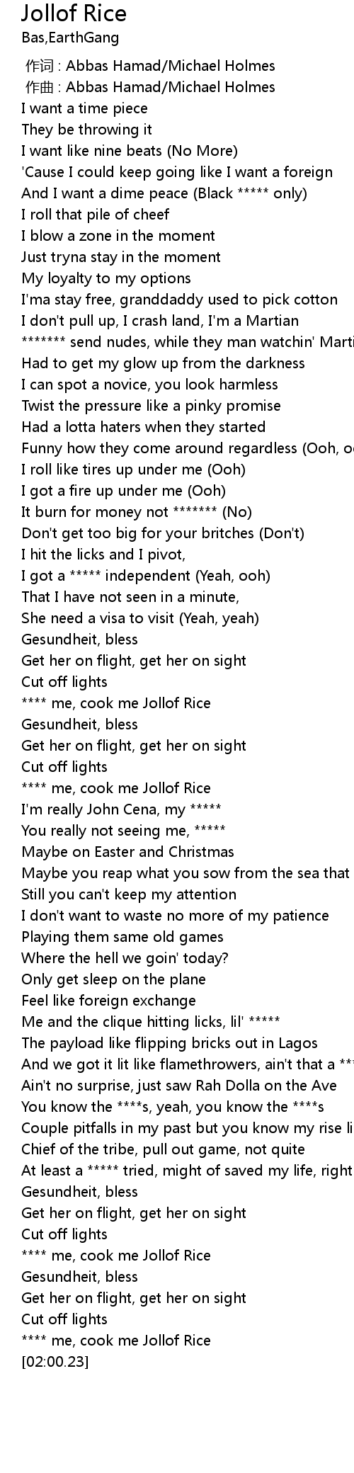 | [01:01.64] | **** me, cook me Jollof Rice |