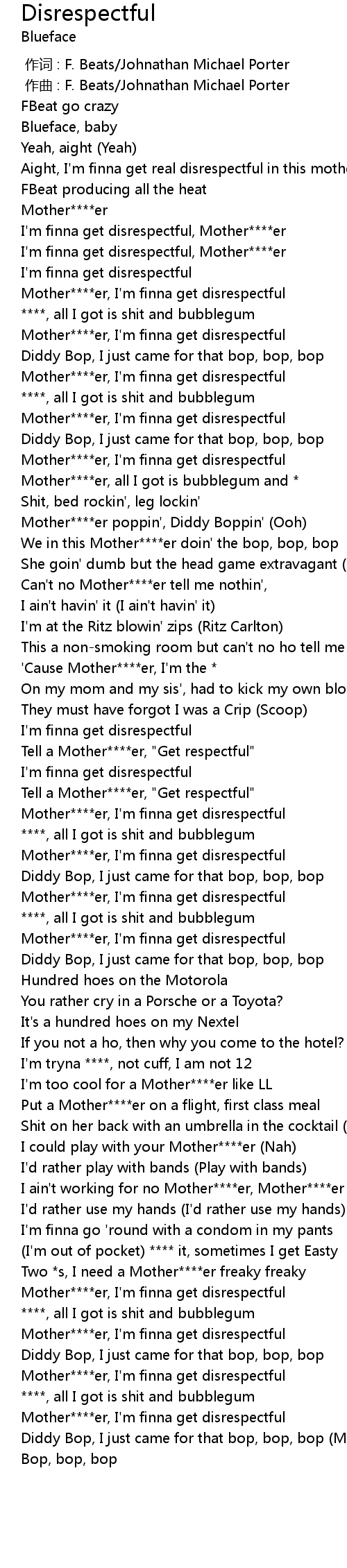 | [01:09.74] | Tell a Mother****er, "Get respectful" |