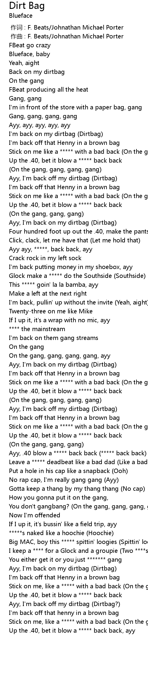 | [01:22.76] | Stick on me like a ***** with a bad back (On the gang) |