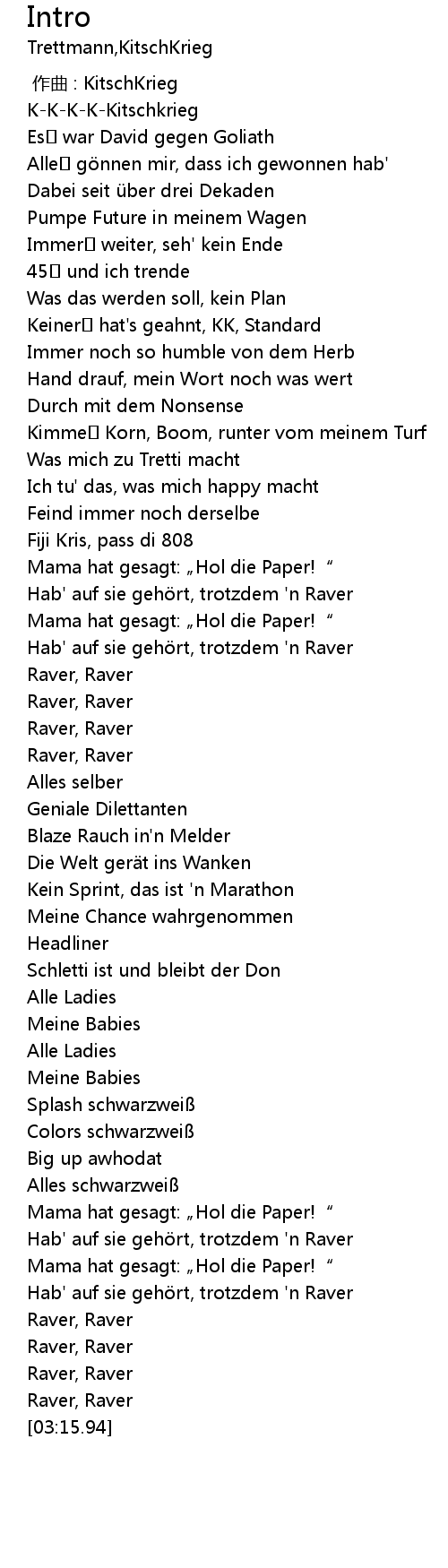 | [02:53.17] | Hab' auf sie geh rt, trotzdem ' n Raver |