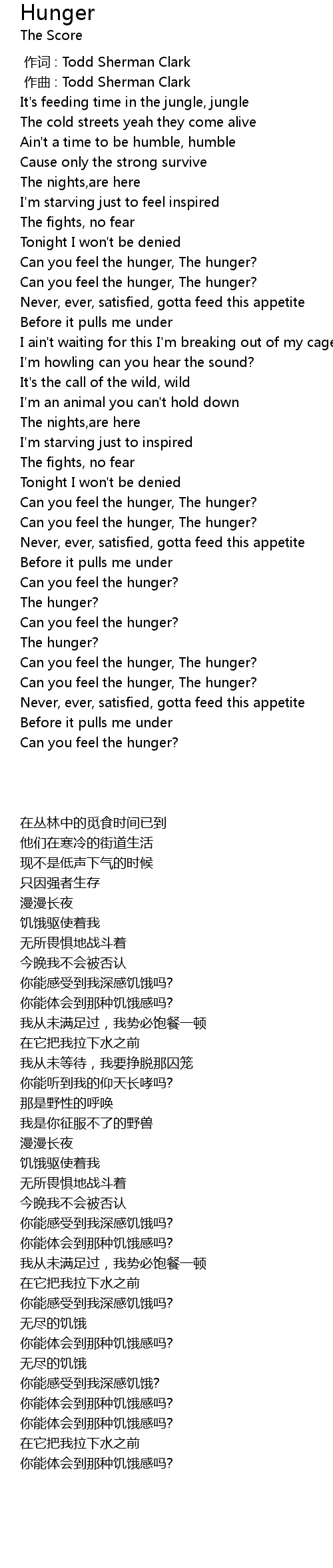 | [01:06.286] | Can you feel the hunger, The hunger? |