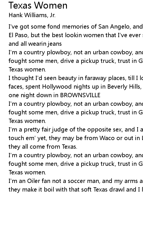 I'm an Oiler fan not a soccer man, and my arms are red and so is my blood, and they make it boil with that soft Texas drawl and I love em all, Texas women. |