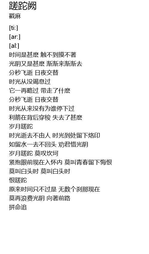 | [03:29.70] | 岁月蹉跎 莫叹坎坷 |