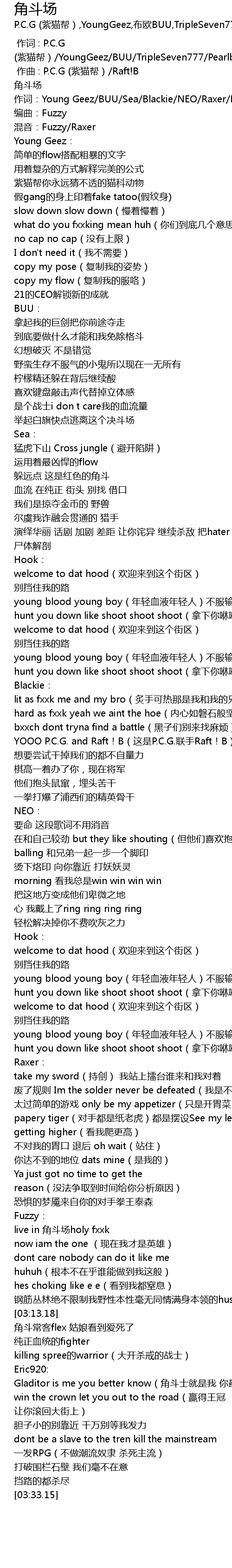 | [00:00.00] | 作词 : P.C.G (紫猫帮)/YoungGeez/BUU/TripleSeven777/Pearlboi111/轰隆隆/RRRRRaxer/Fuzzy/Eric920/Raft!B |