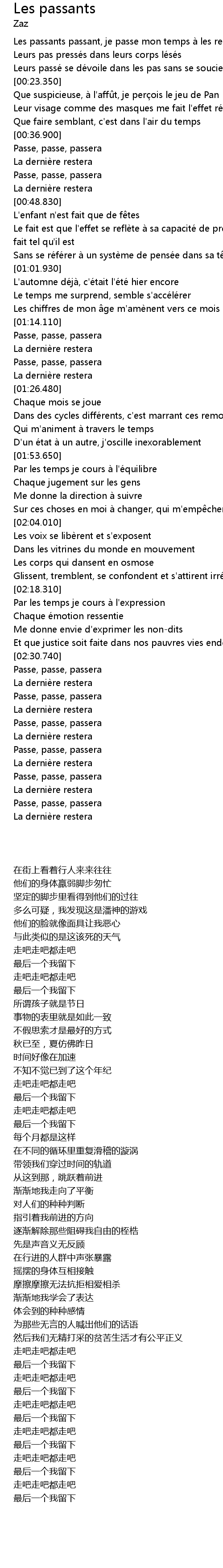 | [00:12.860] | Les passants passant, je passe mon temps a les regarder penser |