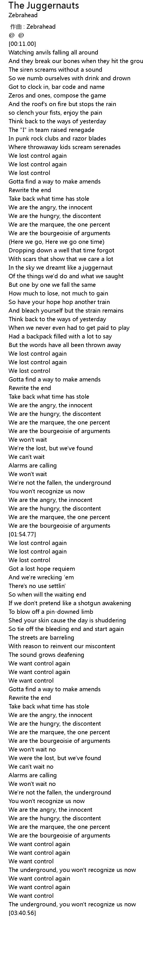 | [00:54.38] | In the sky we dreamt like a juggernaut |