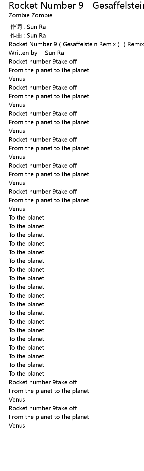 | [00:00.11] | Rocket Number 9(Gesaffelstein Remix)(Remix)-Zombie Zombie |