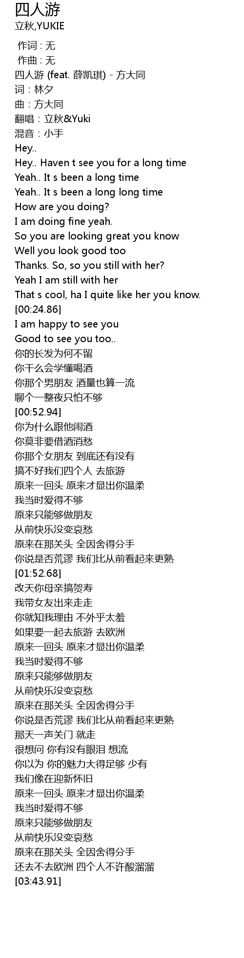 | [00:00.66] | sì rén yóu feat. xuē kǎi qí fāng dà tóng |