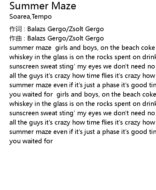 | summer maze girls and boys, on the beach coke and beers are in the fridge whiskey in the glass is on the rocks spent on drinks two hundred bucks sunscreen sweat sting' my eyes we don' t need no fancy bars just you and me and all the guys it' s crazy how time flies it' s crazy how time flies get lost in summer maze even if it' s just a phase it' s good time and sunshine and all that you waited for girls and boys, on the beach coke and beers are in the fridge whiskey in the glass is on the rocks spent on drinks two hundred bucks sunscreen sweat sting' my eyes we don' t need no fancy bars just you and me and all the guys it' s crazy how time flies it' s crazy how time flies get lost in summer maze even if it' s just a phase it' s good time and sunshine and all that you waited for |