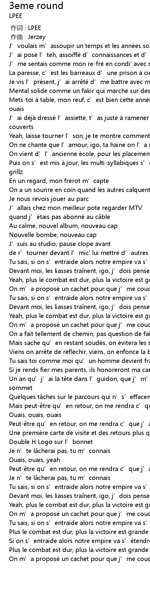 | [03:11.08] | On m' a propose un cachet pour que j' me couche au troisie me round |