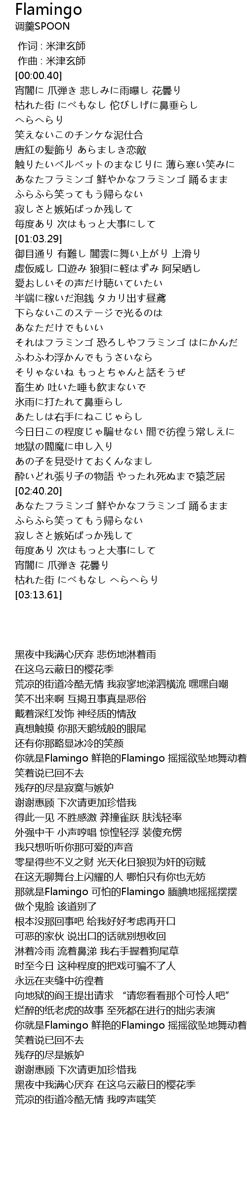 | [00:41.72] | あなたフラミンゴ 鮮やかなフラミンゴ 踊るまま |
