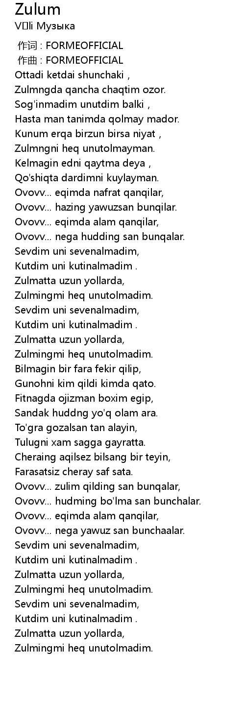 | [00:28.905] | Zulmngda qancha chaqtim ozor. |