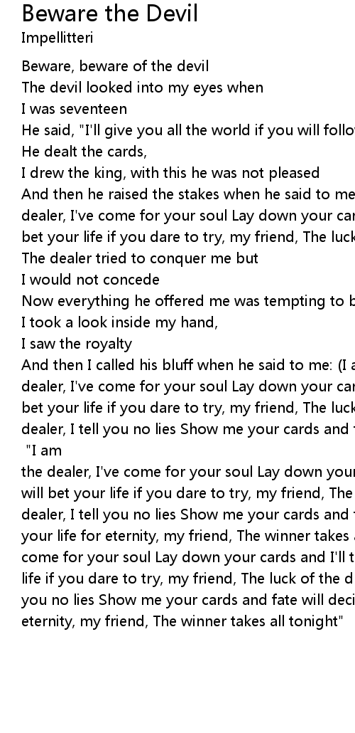 And then he raised the stakes when he said to me: (I am the devil) "I am the dealer, I've come for your soul Lay down your cards and I'll take control I will bet your life if you dare to try, my friend, The luck of the draw tonight" |