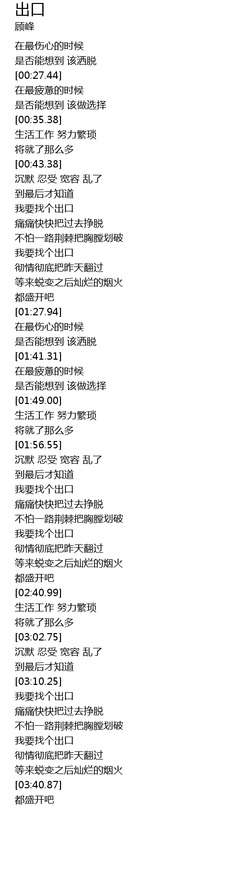 | [03:10.87] | wǒ yào zhǎo gè chū kǒu |